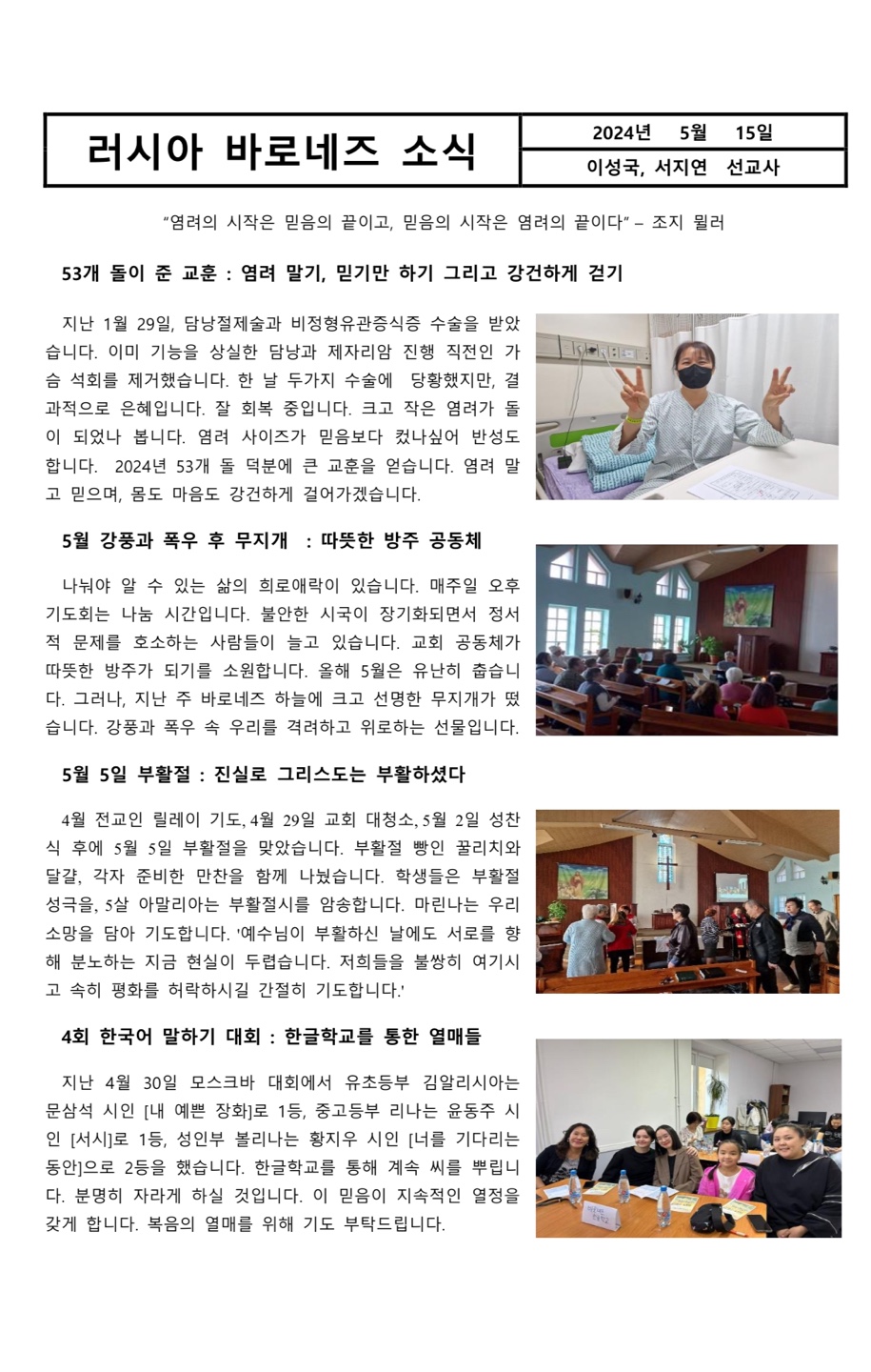 러시아 바로네즈 소식 2024년 5월 by torontobethel on Sep 12, 2024September 12, 2024 Post navigation Previous: 사가목 원주민 선교편지 2024년 7-8월